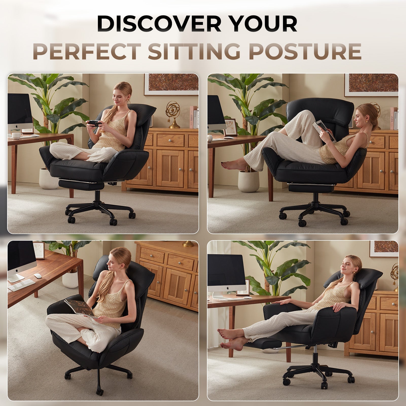 - Reclining Backrest: 90°to 135°:Adjust the reclining backrest from an upright 90° for focused tasks to a relaxed 135° for breaks. Effortlessly lean back to read, watch content, or rest briefly. This flexibility helps reduce fatigue and promotes a healthier sitting posture all day long.
