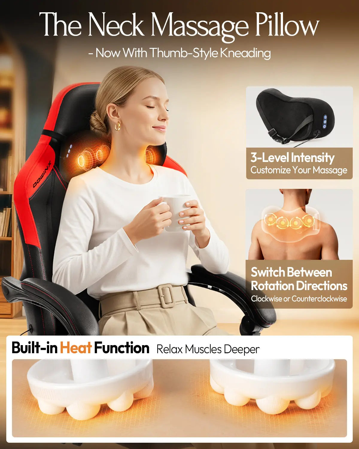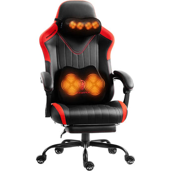 La función de calefacción en esta silla de oficina con masaje trabaja en sinergia con el masaje profundo 3D de amasamiento. El calor relaja los músculos tensos previamente, permitiendo que el masaje actúe más profundo y eficazmente. Esta avanzada silla gamer ofrece masaje de acupresión en sentido horario y antihorario para aliviar la fatiga y el dolor muscular, brindándote una experiencia terapéutica completa similar a un spa profesional. -