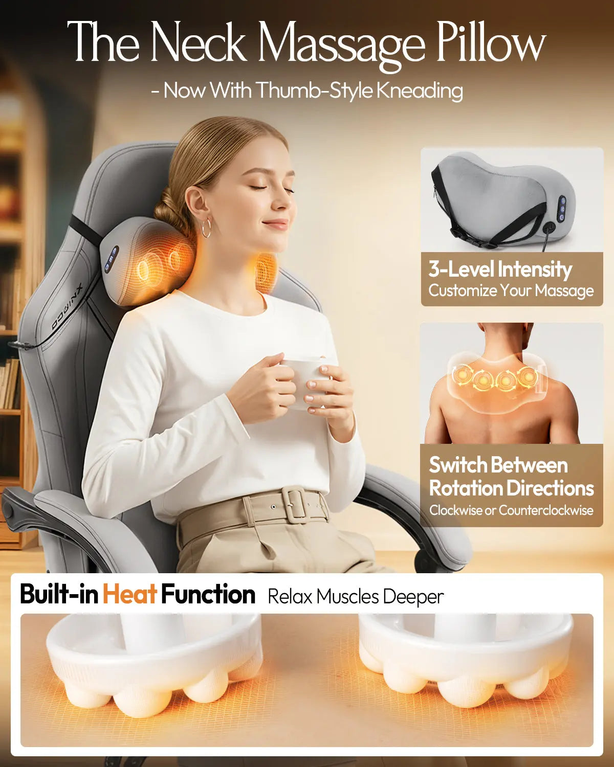 La función de calefacción en esta silla de oficina con masaje trabaja en sinergia con el masaje profundo 3D de amasamiento. El calor relaja los músculos tensos previamente, permitiendo que el masaje actúe más profundo y eficazmente. Esta avanzada silla gamer ofrece masaje de acupresión en sentido horario y antihorario para aliviar la fatiga y el dolor muscular, brindándote una experiencia terapéutica completa similar a un spa profesional. -