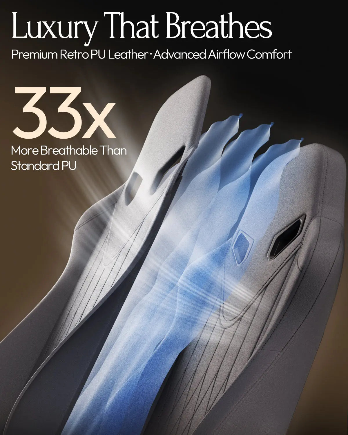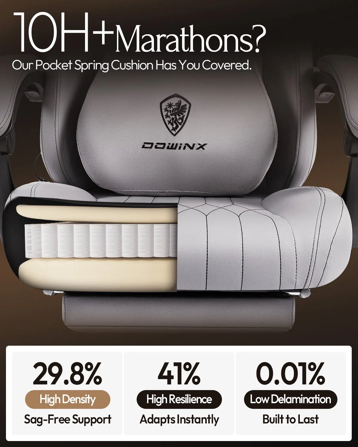 Incluso con la función de calefacción activa, esta silla de juego para adultos siempre se siente fresca. El cuero de alta calidad de la silla de oficina para juegos es 33 veces más transpirable que el material PU estándar, asegurando un flujo de aire continuo. Esto se complementa con un cojín de asiento único de núcleo de muelles de 12 cm de grosor, cuyos muelles integrados proporcionan una suavidad excepcional, soporte corporal perfecto y elasticidad duradera. Combina ventilación refrescante, calor acogedor y una amortiguación como en las nubes, ideal para largas sesiones de juego o días laborales exigentes. -