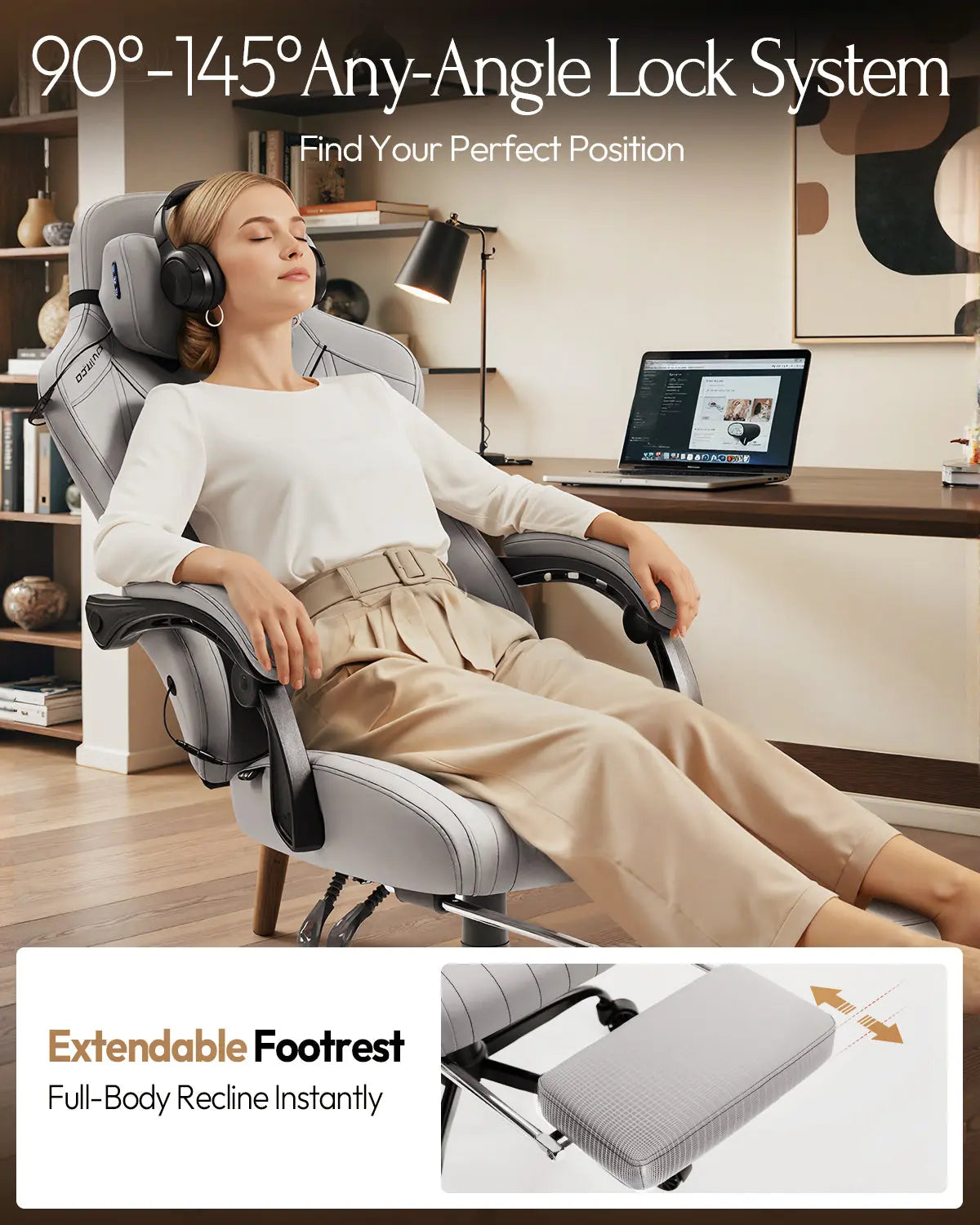 La silla de juego Dowinx está equipada con un motor de alta velocidad de 2800 RPM que ofrece una presión de masaje potente y profunda. El sistema de masaje 3D imita con precisión las técnicas humanas de pulgar y palma y ofrece 3 modos profesionales que se enfocan en el cuello, hombros, espalda y cintura. Esta silla ergonómica para juegos también cuenta con soporte lumbar y de cuello ajustable y un respaldo con forma ergonómica que promueve una postura saludable al sentarse, ideal para sesiones largas. Como silla versátil para PC, combina relajación intensa con comodidad duradera. -