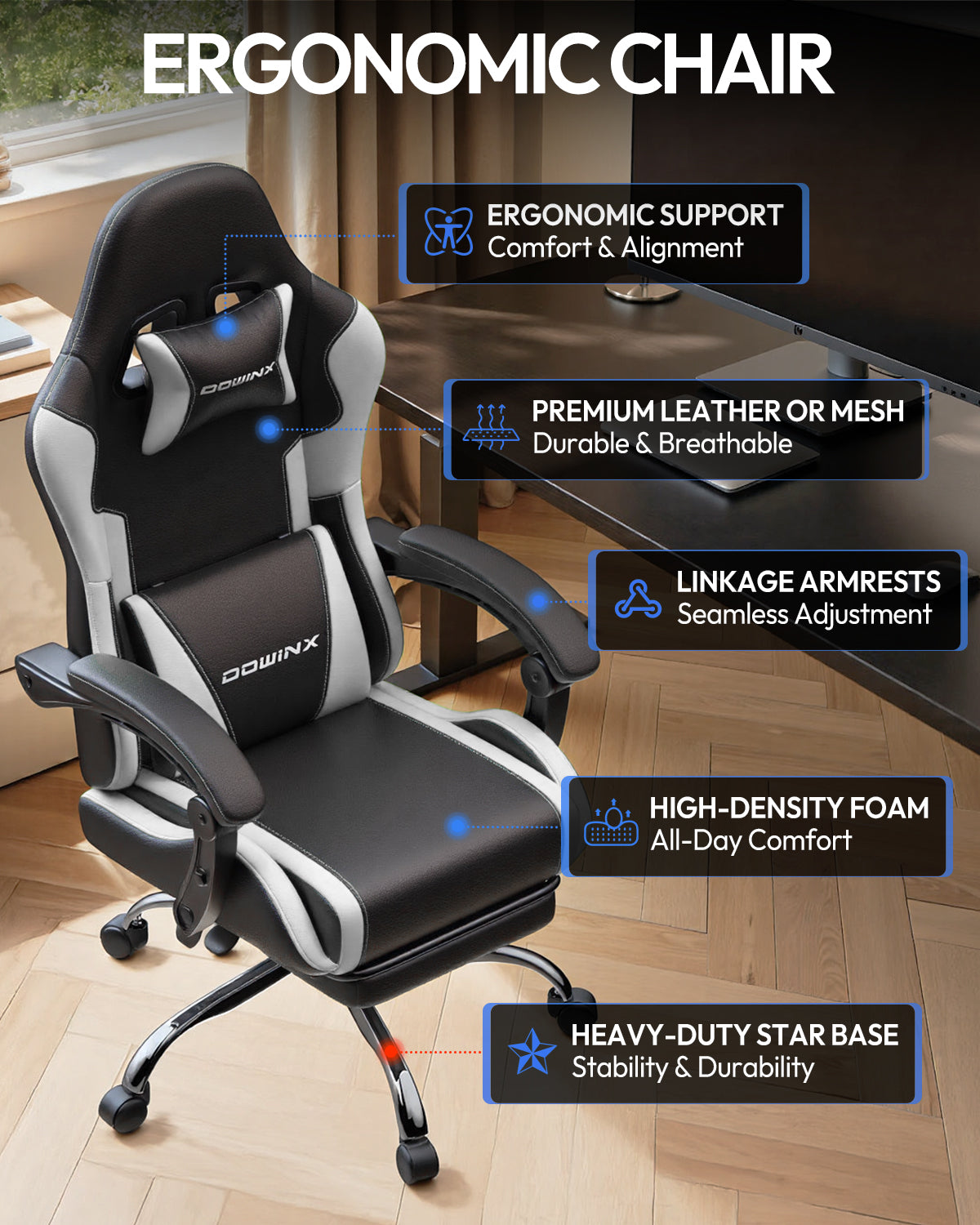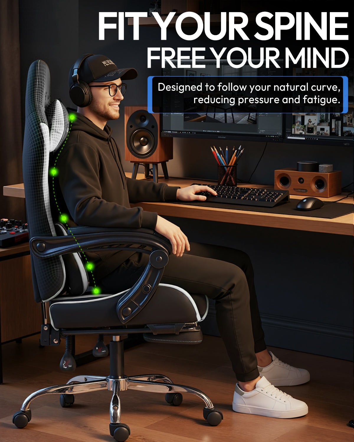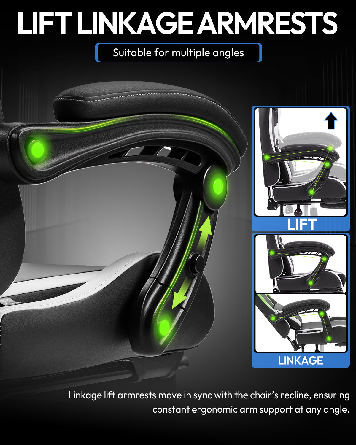 The armrests move in sync with the backrest, providing continuous support for your arms in different positions. Ideal for gaming, working, or relaxing, helping reduce shoulder and arm fatigue.