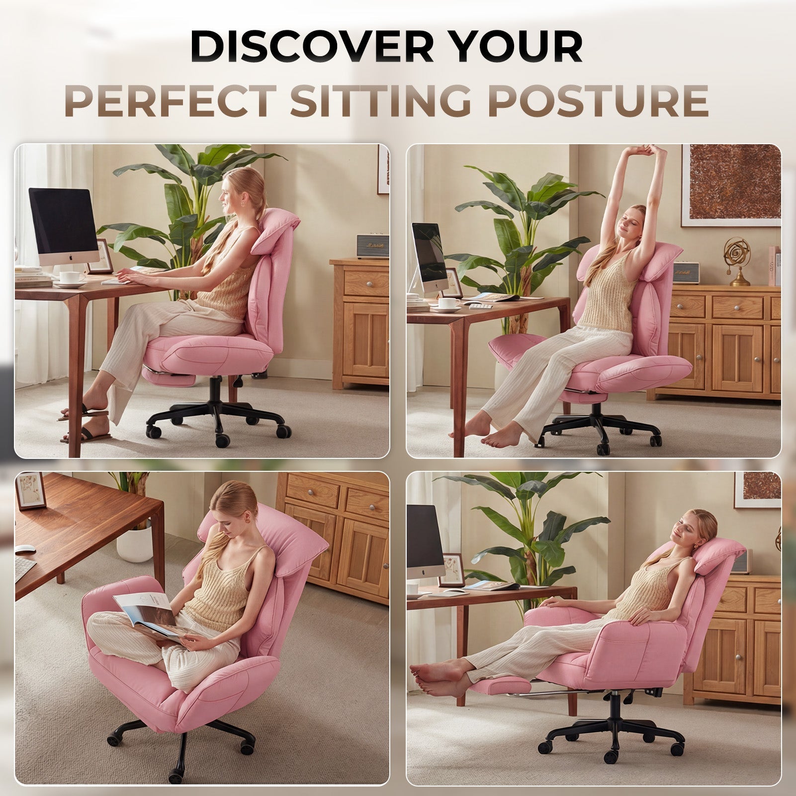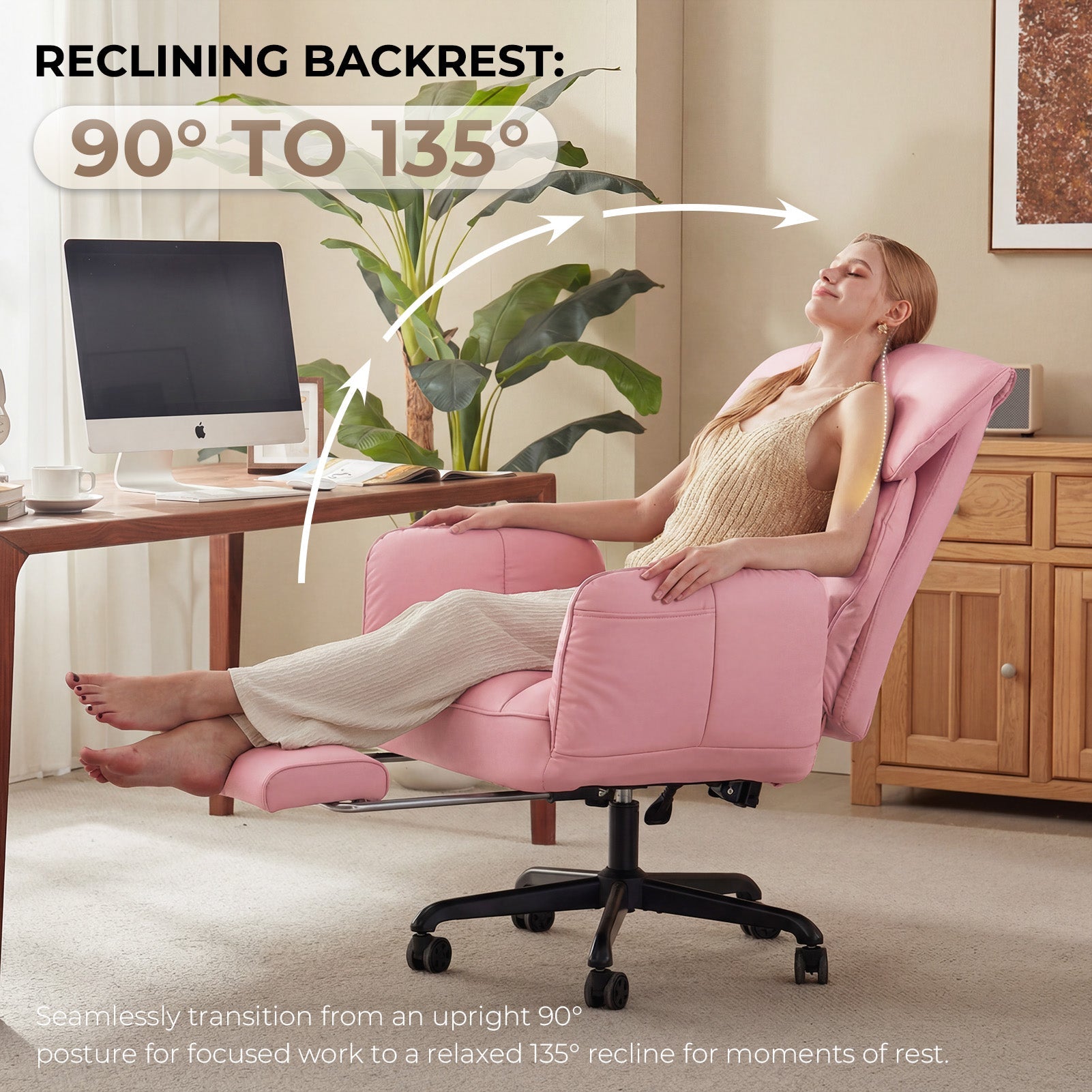 - Reclining Backrest: 90°to 135°:Adjust the reclining backrest from an upright 90° for focused tasks to a relaxed 135° for breaks. Effortlessly lean back to read, watch content, or rest briefly. This flexibility helps reduce fatigue and promotes a healthier sitting posture all day long.